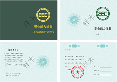 学员经培训并考试合格,由工业和信息化部教育与考试中心颁发职业能力证书。职业能力证书分为初级、中级和高级,证明持证人达到相关岗位要求的专业能力水平,帮助学员提升职业发展空间。企业和学员可随时登中心官网(www.miiteec.org.cn)查询证书信息。