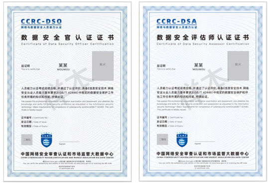 考试通过后,学员将获得中国网络安全审查认证和市场监管大数据中心颁发的CCRC-DSO、CCRC-DSA认证证书: