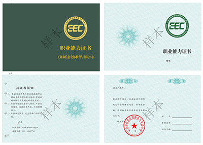 学员经培训并考试合格,由工业和信息化部教育与考试中心颁发职业能力证书。职业能力证书分为初级、中级和高级,证明持证人达到相关岗位要求的专业能力水平,帮助学员提升职业发展空间。企业和学员可随时登中心官网(www.miiteec.org.cn)查询证书信息。