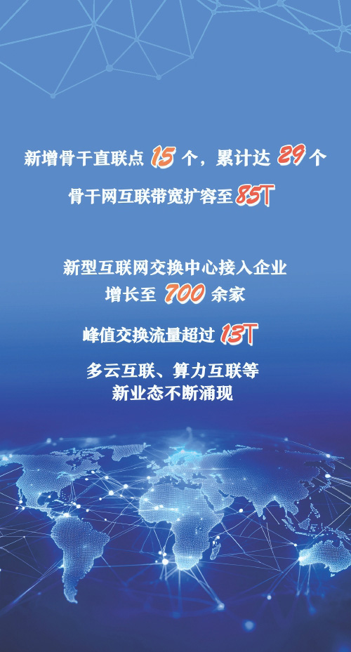 “十四五”期间,我国持续推动互联网网间互联架构演进升级,“全方位、立体化、高水平”互联网网间互联架构基本形成,互联网骨干直联点建设布局持续完善,新型互联网交换中心试点工作取得突出成效。